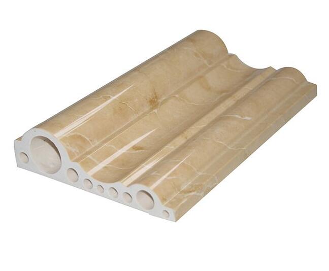 市麵上賣(mài)得比較好的仿大理石線條的原材料是(shì)納米石粉,有著石材的質感,質地堅硬,不易變形,安裝方便,表麵紋理(lǐ)是用水(shuǐ)轉印工藝製作而成,清晰自然,款式多樣。主要用於電視背景牆、電梯(tī)門套、腰線、踢腳線、收(shōu)口線等。